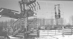 The Wanham, Alberta, farmer's cow catcher consists simply of a 6 by 12-ft. cage with a commercial head gate mounted on front. The catcher's main frame is built of 2-in. sq. tubing, with smaller square tubing used on the side rails.