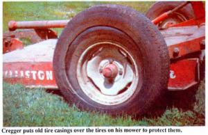 "It's a simple idea but it works great to prevent flat tires on my rotary mower," says Irvan Creeger, Woodsboro, Md., who cuts out the bead and part of the sidewall on one side of junked out tire casings, then slips them over the smaller pneumatic tires on his mower.