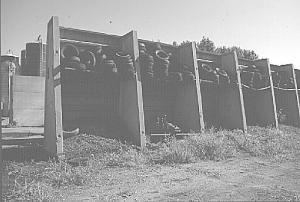He simply installed storage racks between the concrete uprights all along either side of his bunker silo. The racks are high enough so the tires can be reached from inside the silo when it's filled.