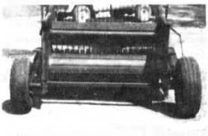 Nuss paid $120 for the baler which had been damaged in a fire. He removed the tailgate, belts and rollers, and most of the sheet metal behind the axle, keeping only the baler's pickup, drum, and axle. -He shortened the chain that drove the rollers and drum and remounted it on the left side of the baler so the drum would rotate in the same direction as the pickup to keep the crop moving rearward.