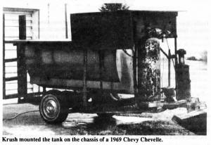 He mounted the tank on the chassis of a 1969 Chevy Chevelle, and then cut down the sides of the tank, reattaching the lids of the tank to the inside walls of the tank to serve as benches. Then he built a wooden deck and stairs on one side of the tank.