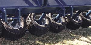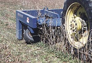 It features a gang of heavy-duty 8-in turf tires mounted on drive shafts up front. They're chain-driven off a ground-driven gearbox on the machine's left side and are adjustable from 6 to 18 in. off ground. The tires rotate against each other to pull stalks.