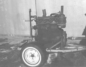Goby used a 350 cu. in. engine out of late 1940's WD9 IHC tractor he bought from a neighbor. It mounts on a two-wheel trailer made from a 1/2-ton pickup axle.