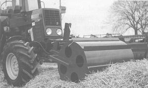 The roller fits into brackets bolted directly to the front of the baler tractor. A hydraulic cylinder lifts it for transport.