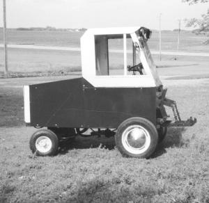 Fisher unveiled the tractor at the recent Minnesota Inventors Congress near Redwood Falls, Minn. The 2-WD rig measures 8 1/2 ft. long, 6 ft. high, and 56 in. wide and has a cab as well as a 3-pt. hitch and pto on front. It rides on a pair of 15-in. car tires on front and 10-in. tires on back. Power is supplied by an 18 hp Briggs & Stratton gas engine. Fisher used the bean rider's engine, seat, hydrostatic transmission, live hydraulics, power steering, fuel and hydraulic tanks, hydraulic hose, and battery. He made his own chassis including the drive axle and steering axle. "I have a line of equipment that I use with it including a 5-ft. belly mower, a sprayer, snowblower, worktable, push hitch, and dozer blade," says Fisher. "One lever controls for-ward and reverse and another lever engages the pto, which is direct-driven off the engine crankshaft. I use the pto to operate the snow-blower and mower. The pto could also be used to operate an auger.