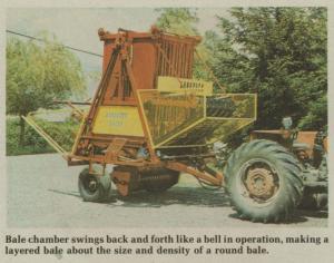 In operation, the windrow is picked up by a conventional pickup and deposited on compactor rollers that compress the layers of hay and deposit them in the bale chamber,which swings back and forth 45 times a minute to fold and form the bale. The deposited layers force the bale upward against a density control. After reaching the desired length and density, the bale is tied with 5 twine strings and discharged out the back, with the baler stopped like a conventional round baler. It requires about 65 hp to operate.