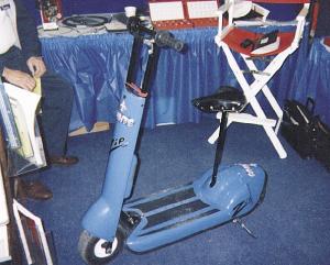 Our new electric scooter is smaller and weighs much less than other electric scooters on the market. The 40-in. long rig rides on two 9-in. high, 3 1/2-in. wide pneumatic wheels and weighs only 66 lbs. with a built-in 12-volt battery. The battery belt-drives the rear wheel and comes with a built-in charger. There are only two controls - the throttle on the right handle and the hand brake on the left handle. By removing a pin the scooter can be folded down to a height of only 12 in., allowing it to fit easily into a car trunk.