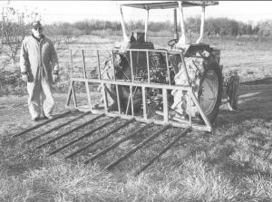 The rake is 3-pt. mounted and has a hydraulic cylinder at the top. It's made out of tube steel with six 5-ft. fork tines. Malham windrows the pruned limbs and then uses the rake to pick them up.