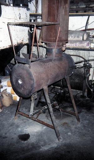 The stove is equipped with a 4-ft. high water jacket around the flue that transfers hot water to the trailer house. It burns from 3/4 to 1 1/2 gal. of waste oil per hour.