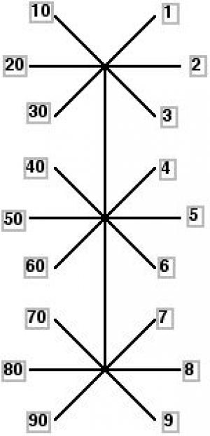 Here's how it works. The grid, at left, shows the position of angled lines surrounding a single long straight line. The lines down the left side are numbered in 10's from 10 to 90. The lines down the right side are numbered from 1 to 9. To create a number, you draw a straight vertical line representing the long line down the middle and then put one or more lines on either side of the line. If there's no line on a side, it's zero. To make bigger numbers, you combine two or more sets of symbols together.