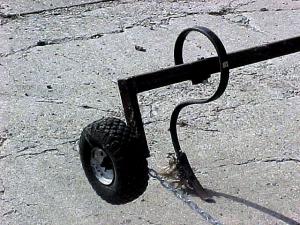 Wichmann mounted a single Danish tooth at the end of the marker to form the row mark. A used 6-in. lawn mower wheel mounts at the end of the tubing to become both a depth gauge and a carrier for the Danish tooth. Chain runs from the end of the marker to a hook on the front bumper of the pickup.