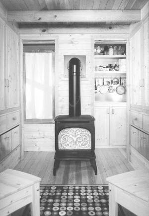 He used 2 by 4 exterior walls, with the studs spaced at 24 in. Between the studs, he used polystyrene foam board. He installed double pane windows with argon gas for insulation sealed between the panes. A propane heater with the look of an old wood stove provides more than enough heat for even the coldest nights, he says. The house has electricity and plumbing.