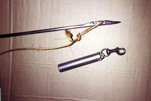 Here are photos of a large needle we have used for 30 years to push bale twine through Hesston hay stacks to tie them down so wind won't blow them apart. Once the twine is through the stack, we weigh down the ends with weights made out of solid bar stock that we clip to the ends of the twine. The needle has a large handle for pushing it through. It has always worked great for us. (John C. Haldemann, HCR 70, Box 20, Chinook, Mont. 59523)