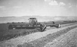 The draper header gives them the option of dropping cut hay in the center or off either end. They can change the drop by flipping a switch in the cab. The hydro-swing tongue on the conditioner allows them to keep it aligned with the swath coming off the header.