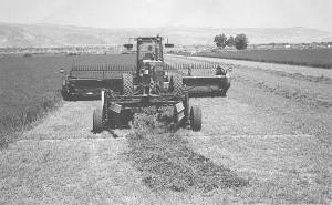 The Tufts own a Ford Versatile 9030 Bi-Directional tractor and had been cutting hay with two 12-ft. mower conditioners - one up front and one behind and to the side. Both mowers dropped a windrow out the center so all windrows were spaced 12 ft. apart.