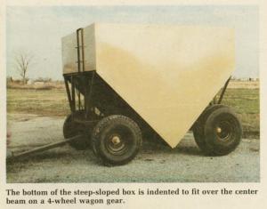 Weeks explains how the wagon reaches such a low point and thus the steep dumping angle. "The bottom of the V-shaped box is indented to fit over the center beam on a 4-wheel wagon gear. This gives the wagon a very low center of gravity ù so low that it pulls easier than conventional wagons and, of course, dumps much quicker and with less work," says Weeks.