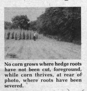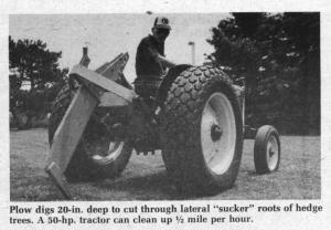 Root plows, which sell for anywhere from $300 to $500, consist of a single, 36-in. long shanked cutter with a blunt edge. Working with a 50 hp tractor a farmer can clean up about ¢ mile of hedge row per hour. It's necessary to make two passes, the first with the root plow at 12 to 15 in. deep and the second at the full working depth of 20 in. It's best to work about 15 to 20 ft. from the edge of the hedge row. The process doesn't effect growth of the hedge, according to Cole, and roots regrow at 1 to 2 ft. per year.