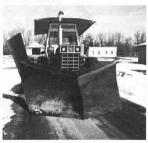 Last winter I bought this big 10-ft. wide "V" snowplow at a county auction sale for $80 and mounted it on my 1466 IH tractor. The plow is controlled by a 'hydraulic cylinder on front of the tractor. It has a home-built wing on one side that's raised and lowered by a hydraulic orbit motor that drives a cable winch. Works real well around the farm. (Ernest Grotte, Rt. 1, Box 70, Finley, N. Da k. 58230 ph 701 524-2294)