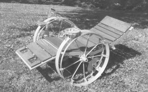 A pair of small disc harrow wheels on the back side of the backrest keep it stable in the reclining position. The wheels also allow the chair to be moved anywhere in the reclining position.