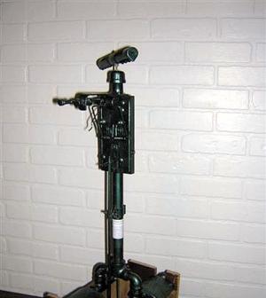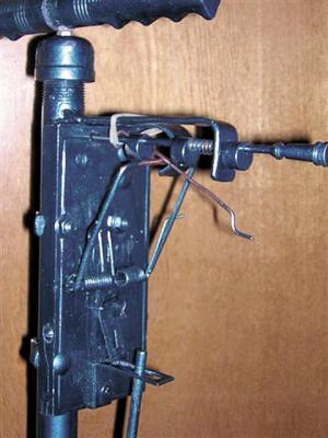 There's a heavy metal spring inside that's fastened to the sharpened metal rod. The spring is stretched into the "loaded" position by the handle on top. A pin that goes through a hole in the pipe keeps it cocked. The rat trap connects to the pin and also to a trigger that goes down the pipe into the tunnel.