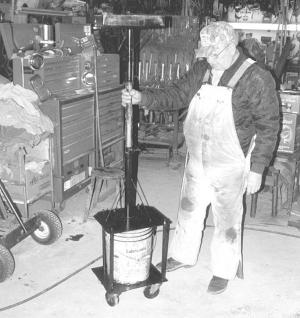 Roger Foster, Tower Hill, Ill.: "For positive control of oil being drained from elevated vehicles, its hard to beat the rollabout caddy that I use in my shop. The catch pan above is directly connected to the catch container below, and the pipe lets me position the unit under the vehicle being serviced. It eliminates the need to line up the oil flow from above to hit a catchpan below, which can result in frequent oil spills and dangerously slick floors.
