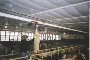It's easy to use. "Pull the cable out to the pig, wrap it around the pig's back feet and then the pig is winched up and simply push the carcass out of the building using the I-beam that the hoist and trolley are attached to," says Becky Travis, Wyman's wife.