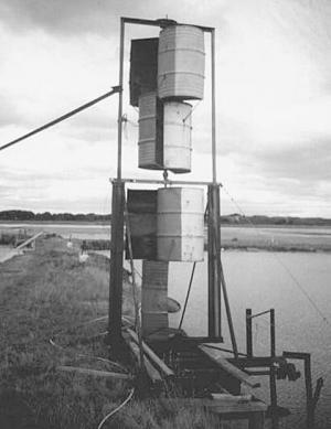 They rounded up four empty 44-gal. drums and cut them all in half lengthwise, giving them eight halves. They constructed a tower about 20 ft. tall using 2-in. steel pipe with 1 1/2-in. pipe for bracing.