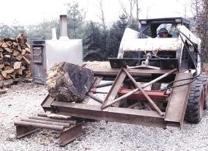The platform elevates the log off the ground, making it easier for the skid loader operator to access. It consists of a series of 3-ft. long steel pipes spaced apart at different widths.