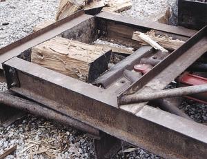 The machine is designed to pick up large diameter logs, bring them to a small raised platform, and then split them. A 4 by 24-in. hydraulic cylinder pushes against a 30-in. wide steel wedge that does the splitting. The wedge is braced at the center by a pair of heavy duty pipes, which are welded to a frame that slides inside a pair of I-beams. Inside the I-beam frame, Marley welded 2 1/2-in. dia. pipe inside both I-beams to provide a guide for the frame on which the wedge is mounted.