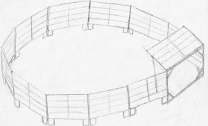 Brown builds the traps with light square tubing in 12-ft. sections. He incorporates 11 panels in a keyhole configuration, with a trip-operated 10-ft. gate that swings down from above. For horses, the panels are built high so there's no chance of them trying to jump out.