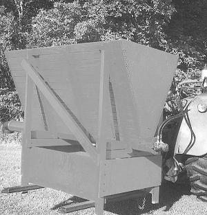 "The beauty of it is that I only had to buy some 2 by 4's and a little plywood for around the base to provide structural support," says Blaine Schumacher. "It holds 35 to 40 bushels of feed and rides on my rear-mounted bale forks. All I have to do is raise the bale forks to adjust to bunk height."