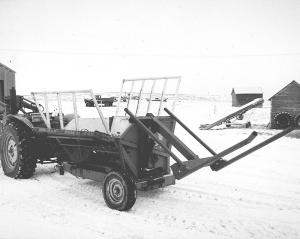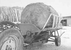 "I have an automatic hydraulic loader so I don't have to unhook the tractor to load bales," Hacault says. Tines slip under the bale, then lift it into the cart.