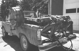 To remove the wire rolls, he swings the rim down to the ground behind the pickup with the bale arm. He unbolts the strapping holding the wire on the rim and slips the neatly rolled wire off. He bolts the strapping back on, swings the rim back in place, and he's ready to go again.