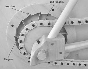 It consisted of a hub with fingers, thin pieces of wood sticking out from the center. When engaged, the fingers would catch and hold on notches of wood as Facciola pedaled, but when coasting, they would slip past the notches.