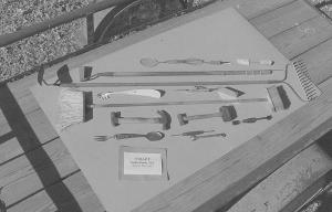 Some example of his doubled-up tools include: A screwdriver combination with a flat head on one end and a Phillips head on the other; claw hammer and ball peen; brass mallet and rubber mallet; kitchen broom and shop broom; hoe and rake; scrub brush and rubber scraper; egg beater and oval whip; weed chopper and spike; fork and hamburger flipper for grilling; flat wire brush and round "reaming" brush; spaghetti claw and serrated plastic knife; large cook-out spoon and fork; and paring knife and ice pick.