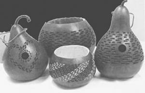 Large gourd varieties include hard shell Kettle, Bushel, African Kettle, Bottle and Tobacco. She also raises smaller varieties for ornaments and containers, such as Sennari and a smaller version of Bottle. Gourds are available clean or unclean, dried or undried. She sells gourds alone as well as in special packages, such as a box of 25 gourds for $96. She also sells how-to pattern books for use with specific gourds.
