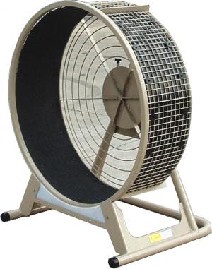 The gerbil wheel-like units come in two styles. The free-standing wheel mounts anywhere there's a flat surface to place it. It's 12 in. wide and comes in 36-in. and 48-in. diameters.