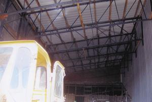 Musser lag screwed the trusses to the outside wall of the existing building. A series of wooden purlins were then lag bolted to the metal trusses, with sheet metal roofing bolted over the top. The bottom ends of the sidewall trusses are bolted to concrete footings.