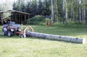 To skid out a log, Stubbs backs the yoke over it until the front arch of the skidder rests against the end of the log. A log chain wrapped around the log is then attached as tight as possible to the sliding ring hook. This places the hook at a point on the diagonal rod closest to the top of the log.