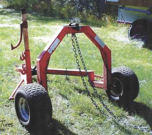 Several add-ons make skidding logs easier. One is a length of pipe welded to the forward arch to hold a cant hook. A chain hook is welded to the forward arch for cases where a log needs to be dragged a short distance before being lifted into position for skidding. Two stump deflectors made from 1-in. steel rod are mounted ahead of the wheels. The front hitch has a handle made from one jaw of a pipe wrench.