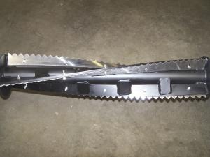 "These combines were originally designed in the 1980's when most farmers were using 20-ft. headers. At that time farmers were more concerned with rocks causing damage to the rotor than with feeding the crop through. However, as farmers started using wider headers, the additional crop material started causing bottlenecks at the rock trap. Our rock beater ensures the rock trap isn't the limiting factor in the combine anymore. A lot of farmers have told us they can go 1/2 to 1 mph faster, and start 1 to 2 hrs. earlier in the morning and never have to reverse the feederhouse." Bolt-on "shark" teeth can be added to increase the feeding ability in extremely green viney crops. A smooth wearing edge is also available.