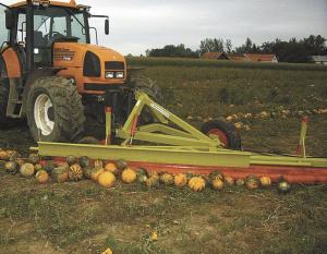 The company's "pumpkin plow" is a V-shaped front-mount blade that moves pumpkins into windrows. Then the harvester runs down the rows. A large wheel fitted with sharp spikes pokes into the pumpkins, lifting them up to be dumped into a wagon hopper.
