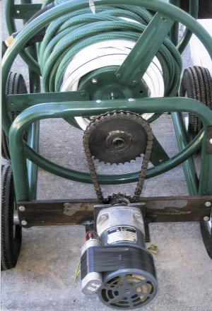 He bought a 4-wheeled steel hose reel unit from Northern Tool and a gear reduction motor from Surplus Center (www.surpluscenter.com). He made a metal bracket to mount the motor at one end of the reel and mounted a sprocket on the motor. Then he removed the reel's original crank handle and mounted another sprocket on it.