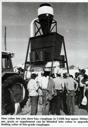 The machine can cube anything from alfalfa to wood bark, corn stalks, straw or cotton lint. The system consists of a hammermill, bin, feeder from the bin, blending chamber and cuber. It's designed to allow the operator to add liquid molasses, grain or other supplement to produce a complete cubed ration. The cubing and mixing process can be done at the field site, or at another more central location, since the unit is designed for portability.