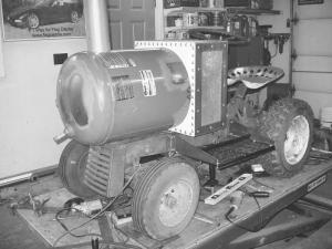 He bought the 1960 tractor at a scrap yard without an engine or hood. He mounted a Sears 30-gal. air compressor tank on front and built a sheet metal box that mounts behind it. A 2-ft. long, 5-in. dia. aluminum smoke stack, made from an oxygen tank off a medical wheelchair, mounts on the tank. A large pressure gauge off an old steam tank mounts on the box, with a smaller gauge on front of the tank. The front grill is original to the garden tractor but is turned upside down, with a "door knocker" emblem mounted on it.