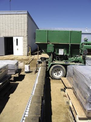 Johnson has the second largest EarthTek block maker, which cost him $60,000. It can be operated by a single person, but is most efficient with two or three people, he says. The machine can produce up to 360, 4-in. high by 14-in. long by 2 to 10-in. wide blocks per hour.