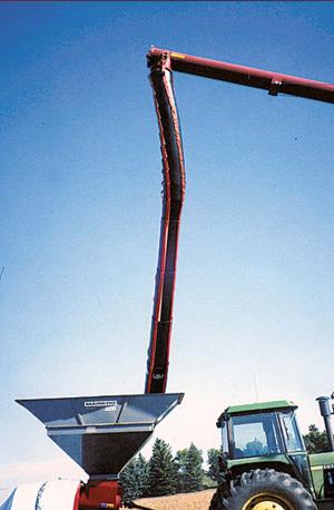 The system consists of four 4-ft. long sections that slide in and out of each other plus 20 sections of flexible spout that attach to the auger. One end of the spout attaches to any auger from 60 to 100 ft. plus long and 10 to 14 in. in dia. and the other end attaches to the hopper on top of the bagger.