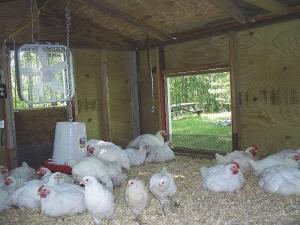 “Chicken wire on the doors gives plenty of ventilation. I made plywood inserts for cold weather protection. The height above the ground makes care much easier and reduces predator problems. I wired it with lights and an outlet for heat lamps or heaters so it can be used year round and plugged in anywhere. There’s a feeder at one end of the 8 by 12-ft. area and water at the other. Birds stay inside at all times although you could rig up a ramp for them to come down to a fenced-in area. However, the 30 Cornish Cross breed we raised are ready for butchering at 6 to 7 weeks so they were fine in litter made from ground corn cobs and wood shavings. I think we could raise 50 birds in there with no problem.
