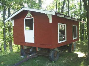 “I had a running gear from an old wagon and used 2 by 12’s for the sills and 2 by 10’s for the floor, all of which were scavenged from an old building. Various 2 by 4’s, plywood and used metal roofing all found their way from various corners of the farm to our ‘Chickenmobile’.