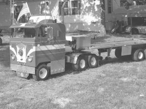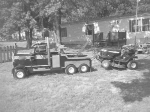 Stockton’s 9-ft. wrecker is equally accurate in detail with air intakes on the sides and forward tipping hood. Like the semi, it contains axles, motor and steering from a riding lawn mower. The metal cab and body were fashioned from a 300-gal. fuel tank.